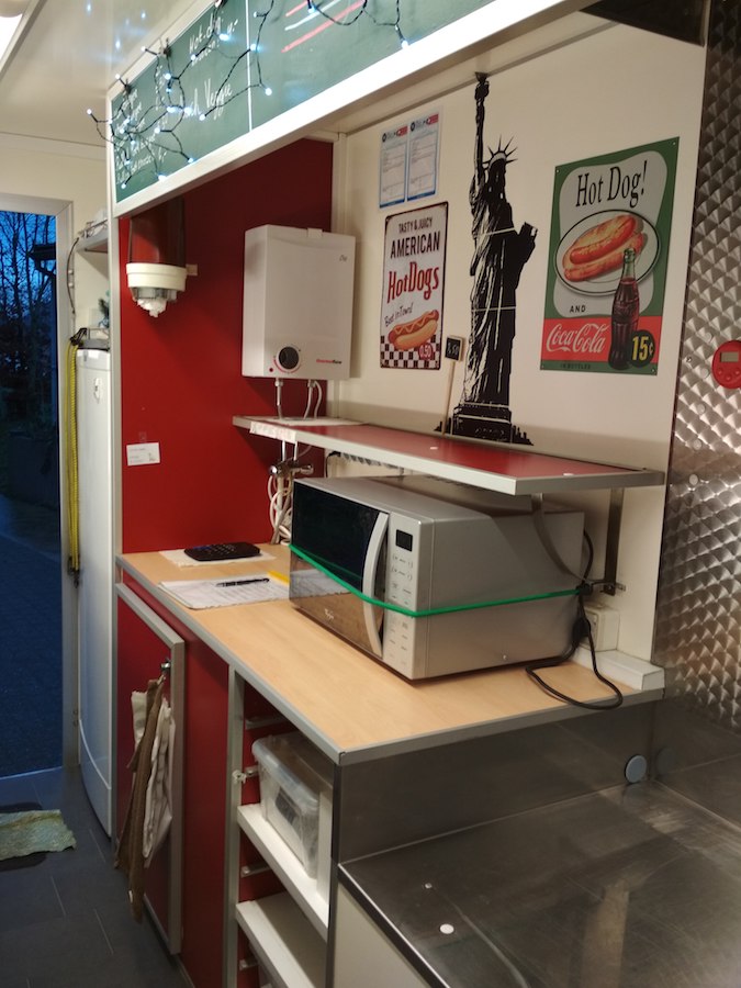 Food-Truck prêt à démarrer. Renault master 3500 avec 30745 km état impeccable première mise en route 28/09/2011, acheté par nous le 15/10/2015 puis aménagé complètement. Euro Norm 5E. Intérieur :2 frigos dont un grand, frigo vitrine pour boissons, 1 freezer,2 bain marie gaz (3 et 6 compartiments), 1 double friteuse 8L/bac gaz et hotte aspirante, 1 plancha 1m 2x3 brûleurs, 1 salamandre, évier électrique et boiler 5 litres, panneau lumineux. Extérieur :1 rangement pour 4 bonbonnes de gaz,1 rangement pour générateur , caméra de recul pratique, pneus été‐hiver avec jantes, bâche coupe-vent avec fenêtre.
